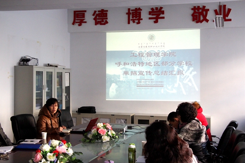 根据学院2015年单独招生考试的总体部署,我院于2014年12月11日召开招生宣传工作会议,全面安排2015年我院呼和浩特地区、乌兰察布地区单独招生宣传及考试工作。2014年12月21日至2015年1月8日,我院领导斯庆、张园、樊文广、雷鸣分别带领部分教师开始了招生宣传工作,走访呼和浩特市区、武川县、土左旗、托克托县、清水河县、集宁区、丰镇市、兴和县、察右前旗、凉城县、卓资县等地区,对近80所普通高中及职业高中的学生进行了招生宣讲。
