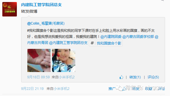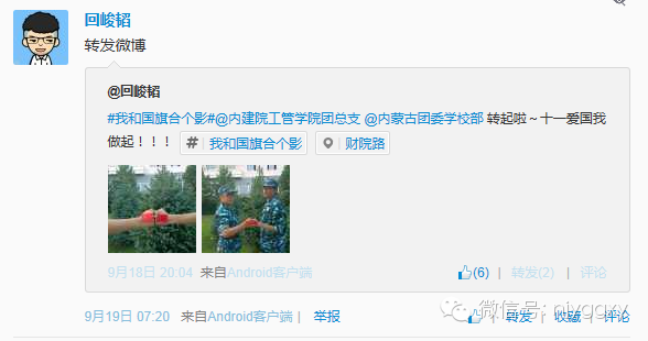飘香九月,火色青春,爱国的思绪盈盈飘荡在秋季。为祝福祖国65华诞,同时增强我院师生的爱国情怀,加强爱国主义教育。2014年9月18日——10月1日,我院以新媒体为载体,在微博、微信上发起“我和国旗合个影”的倡议,开展了“奋斗的青春最美丽.我和国旗合个影”——纪念祖国诞辰65周年活动。
