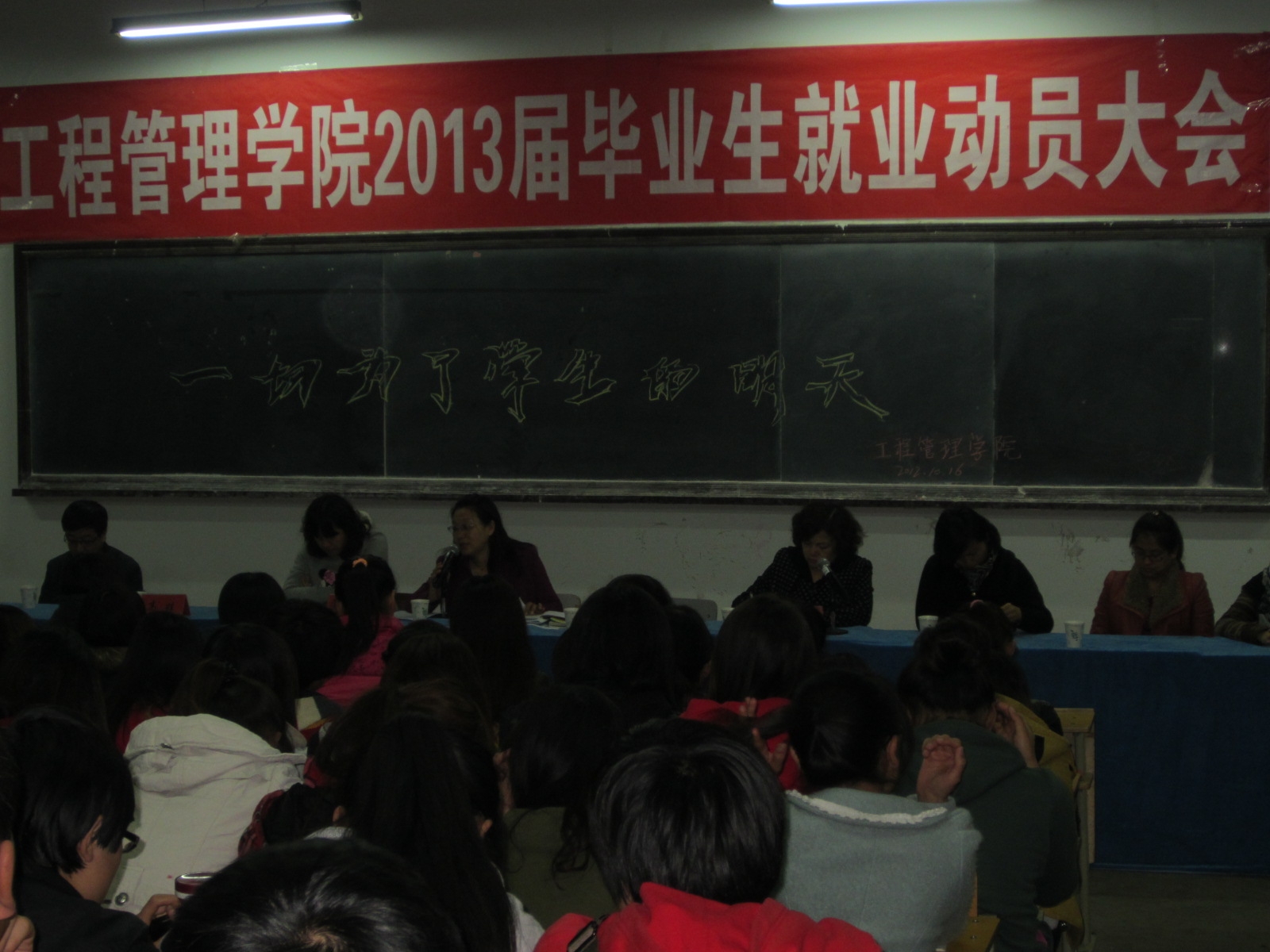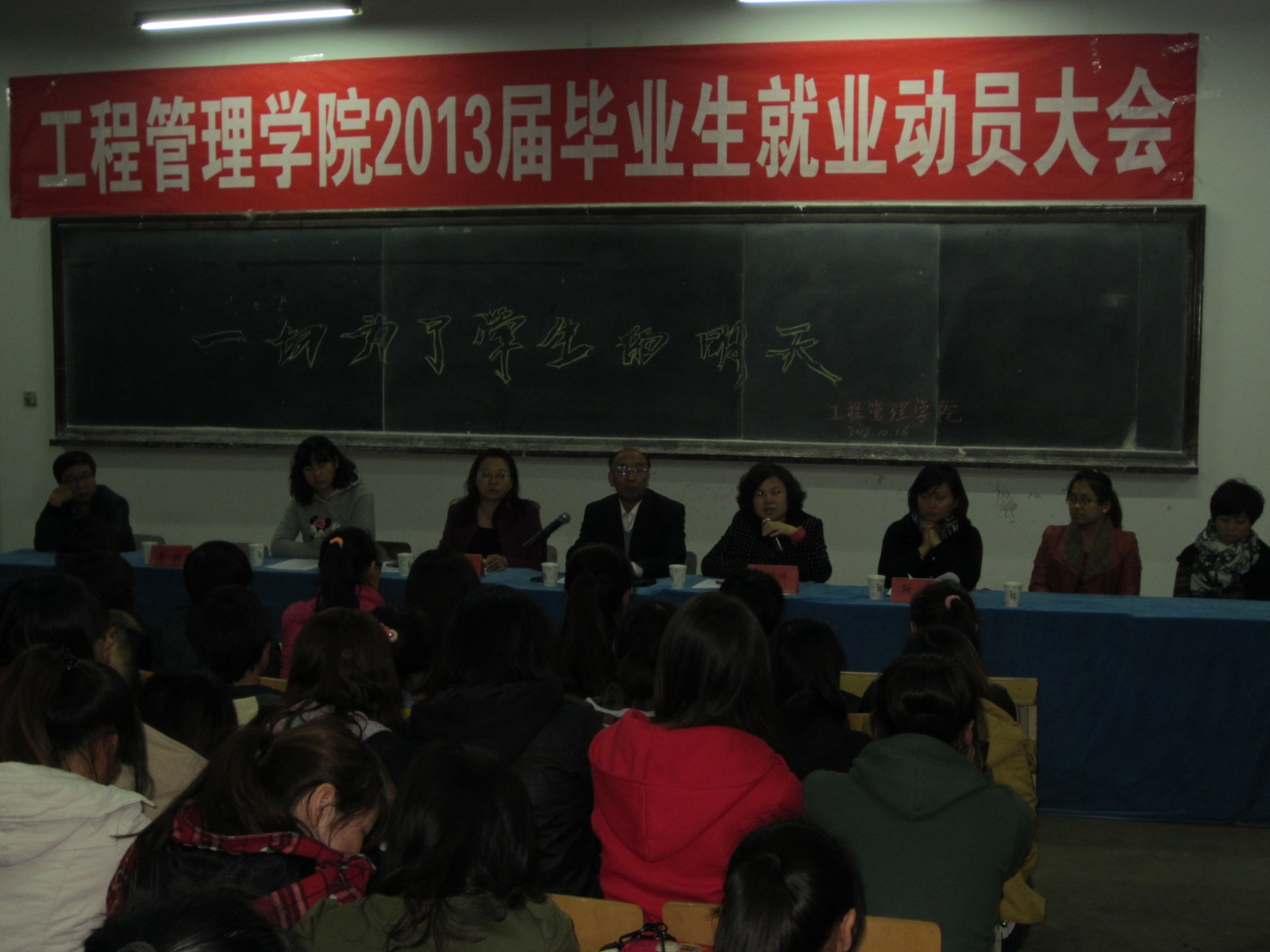 为更好的做好2013届毕业生就业工作,使毕业生做好充分就业准备,尽快找到理想岗位,能更好地适应和服务社会。工程管理学院于10月16日在内蒙古建筑职业技术学院南校区举行2013届毕业生就业动员大会。本次会议由工程管理学院党总支书记张爱华主持,内蒙古建筑职业技术学院副院长乔志远、招生就业处副处长崔丽萍受邀参会,工程管理学院各教研室主任及各毕业班班主任老师出席了本次就业动员大会。