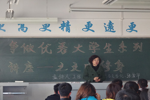 为进一步加强我院学生言行文明和院风、学风建设,全面提升在校生的道德文明素质,以饱满的热情和高昂的斗志迎接党的十八大的胜利召开。 工程管理学院于2012年10月25日下午3:30在一号教学楼205教室举办了“争做优秀大学生系列讲座之文明修身”讲座。工程管理学院党总支书记张爱华同志担任主讲人。内蒙古建筑职业技术学院党委书记巴音巴图同志与工程管理学院的学生共同参加了本次讲座。
