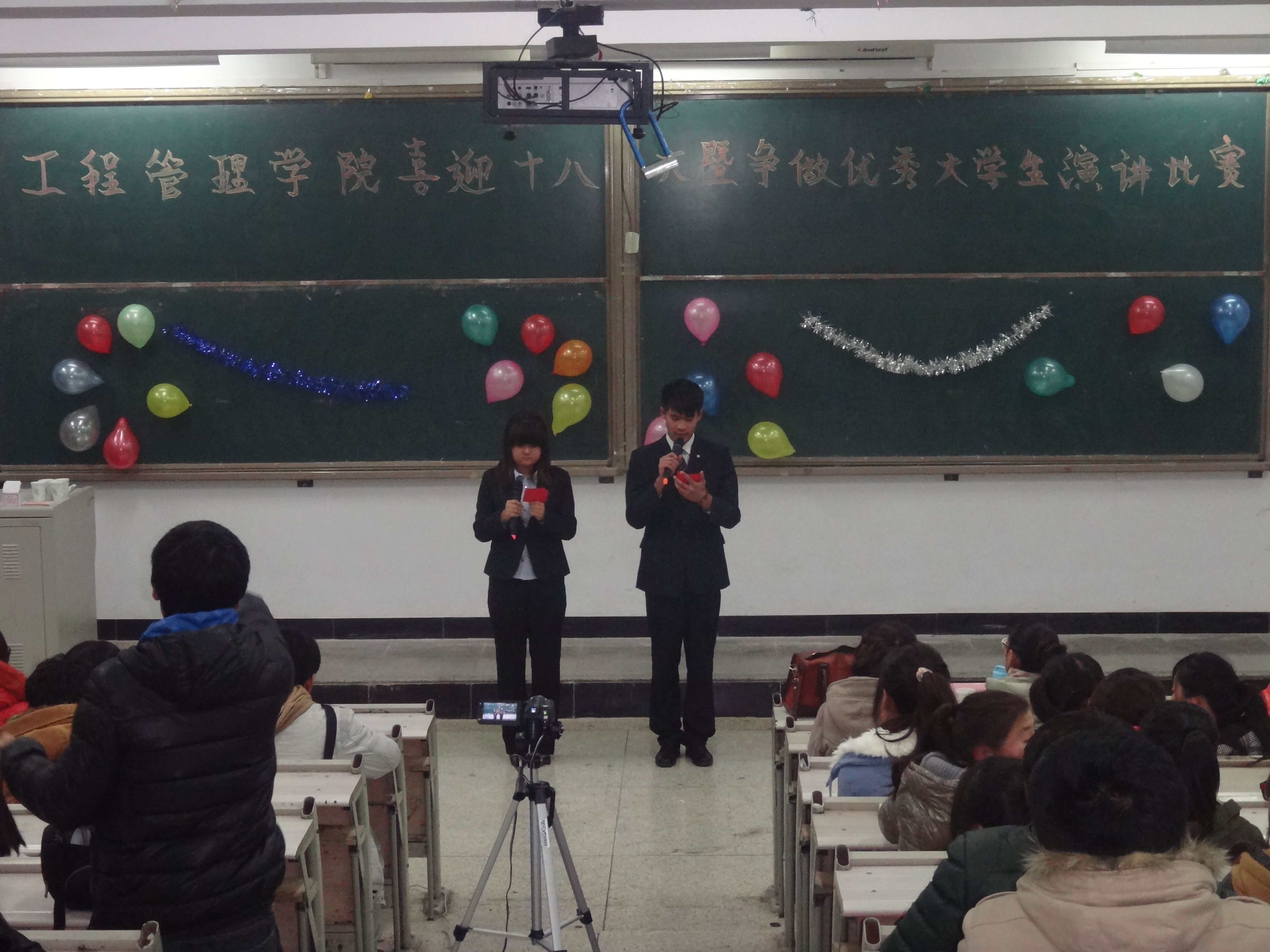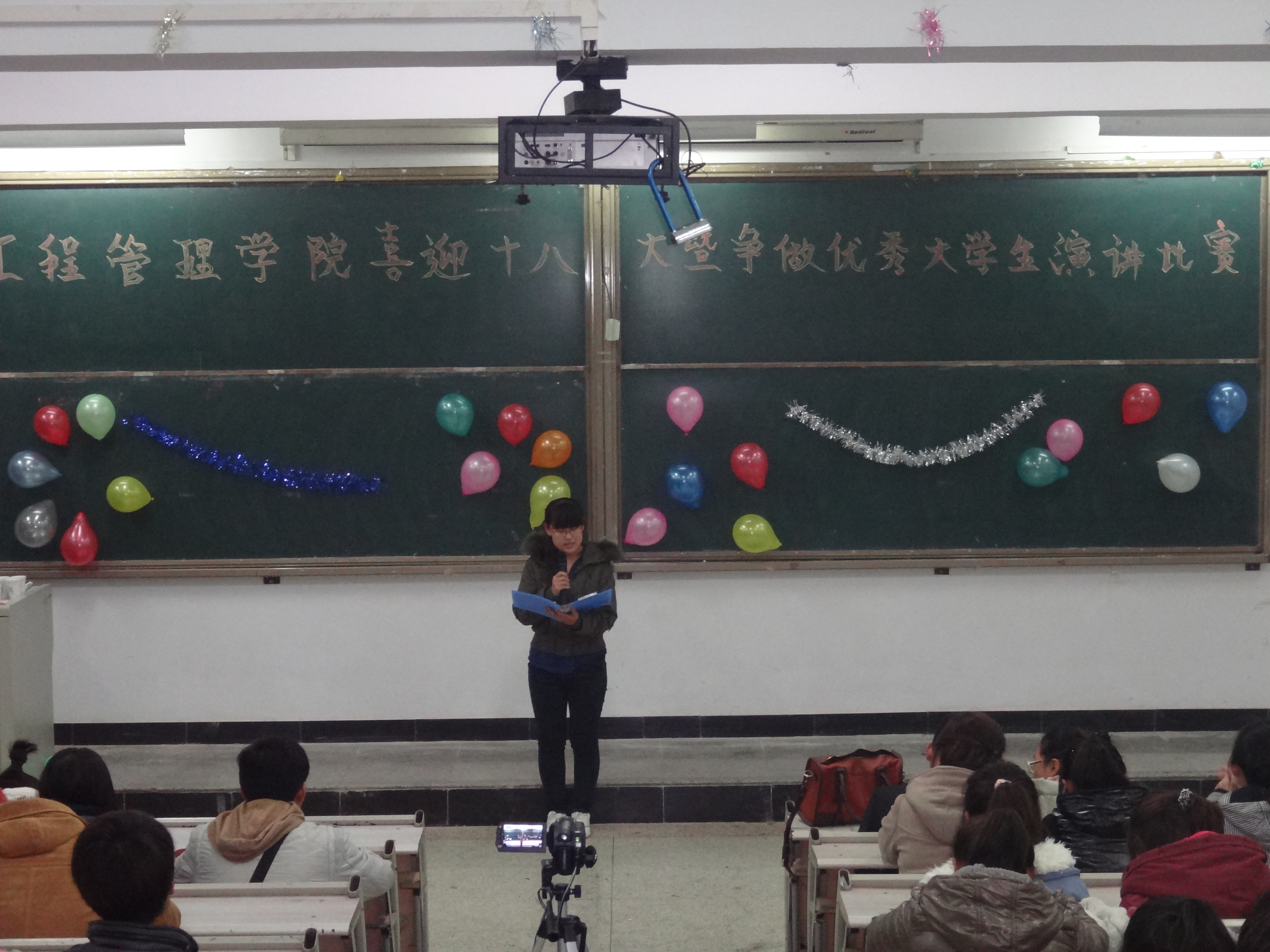 为迎接党的“十八大”胜利召开,深入开展唱读讲传、争做文明大学生,丰富校园文化生活,展示学生才能,彰显学生青春魅力,提高学生综合素质,结合我院实际,2012年11月15日晚7:00,由工程管理学院文艺部承办的“喜迎十八大暨争做优秀大学生”演讲比赛在2号教学楼阶梯101教室隆重举行。工程管理学院党总支书记张爱华、工程管理学院辅导员田原作为嘉宾参加了此次比赛,由学生干部担任本次活动的评委。我院300多名学生现场观看此次比赛。