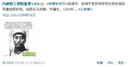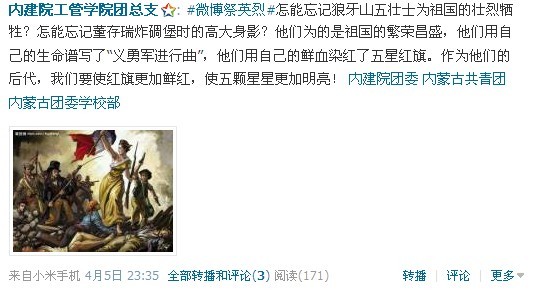 2013年4月4日—4月6日,我分院开展了以“微博祭英烈、清明忆英魂”为主题的清明纪念活动。号召广大青年学生通过微博追忆英雄事迹、寄托哀思之情、祭奠先烈英魂。