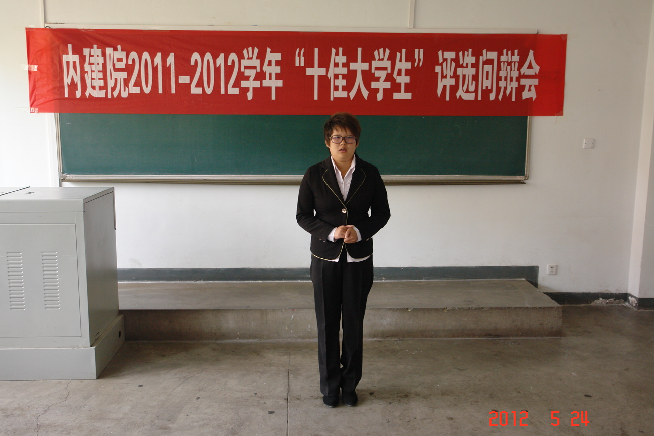 2012年5月24日下午3:00,学院团委在1号教学楼101教室举行内蒙古建筑职业技术学院2011-2012学年“十佳大学生”评选问辨会。院长助理、工会主席谷传德,公共课教学部党总支副书记、副主任张静媛,图书馆副馆长韩献珍担任评选问辨会的评委。20名“十佳大学生”候选人每人用5分钟进行自我介绍并回答评委的现场提问。经过一下午的紧张问辩,最后由各位评委对候选人的综合情况进行合议。我分院郑伟、刘文、刘佳三名同学获得内蒙古建筑职业技术学院2011-2012学年“十佳大学生”称号。