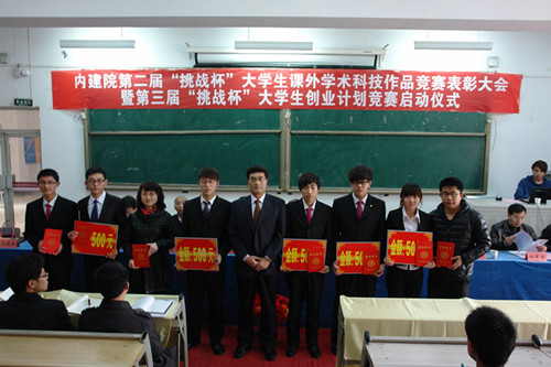 会上,对在全国第十二届“挑战杯”课外学术科技作品竞赛和自治区第七届“挑战杯”课外学术科技作品竞赛中获得优异成绩的9个创业团队、指导教师及一个优秀组织单位给予了表彰奖励并启动了我院第三届“挑战杯”大学生创业计划竞赛。