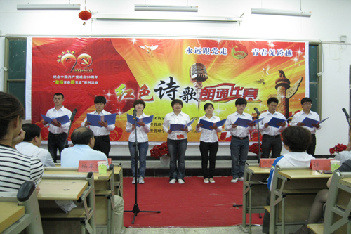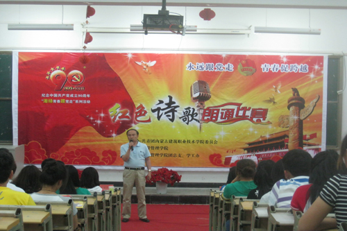 2011年6月8日,为了迎接中国共产党90华诞,团结带领广大青年党员、团员深入学习理解90年来党的光辉历程和宝贵经验,进一步坚定跟党走中国特色社会主义道路的信念。由共青团内蒙古建筑职业技术学院委员会和工程管理学院主办的 “激扬青春跟党走”红色诗歌朗诵比赛在2号教学楼阶梯201隆重举行。学院党委书记巴音巴图、学生工作处副处长、团委副书记丁锐、工程管理学院党总支书记张爱华以及各分院团总支书记、学工办主任参加了本次活动。