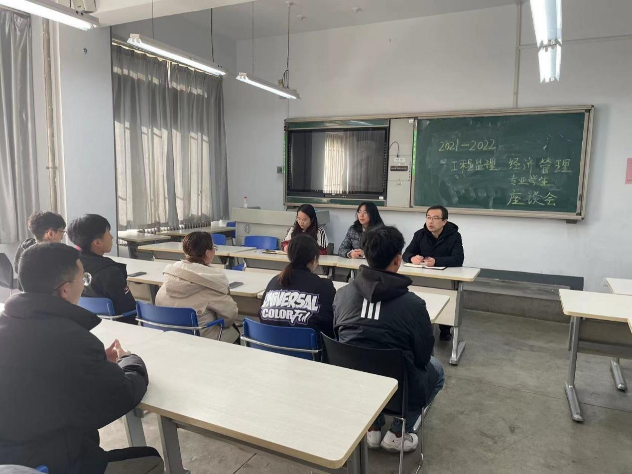 2021年11月24日中午,久久成人精品工程监理教研室召开2021-2022学年第一学期建设工程监理专业、建筑经济管理专业学生座谈会。来自两个专业的9位学生代表参加了座谈会,久久成人精品副院长辛艳红、工程监理教研室主任孙杰、教务中心主任薛亚茹三位教师参加座谈会并与学生现场交流。
