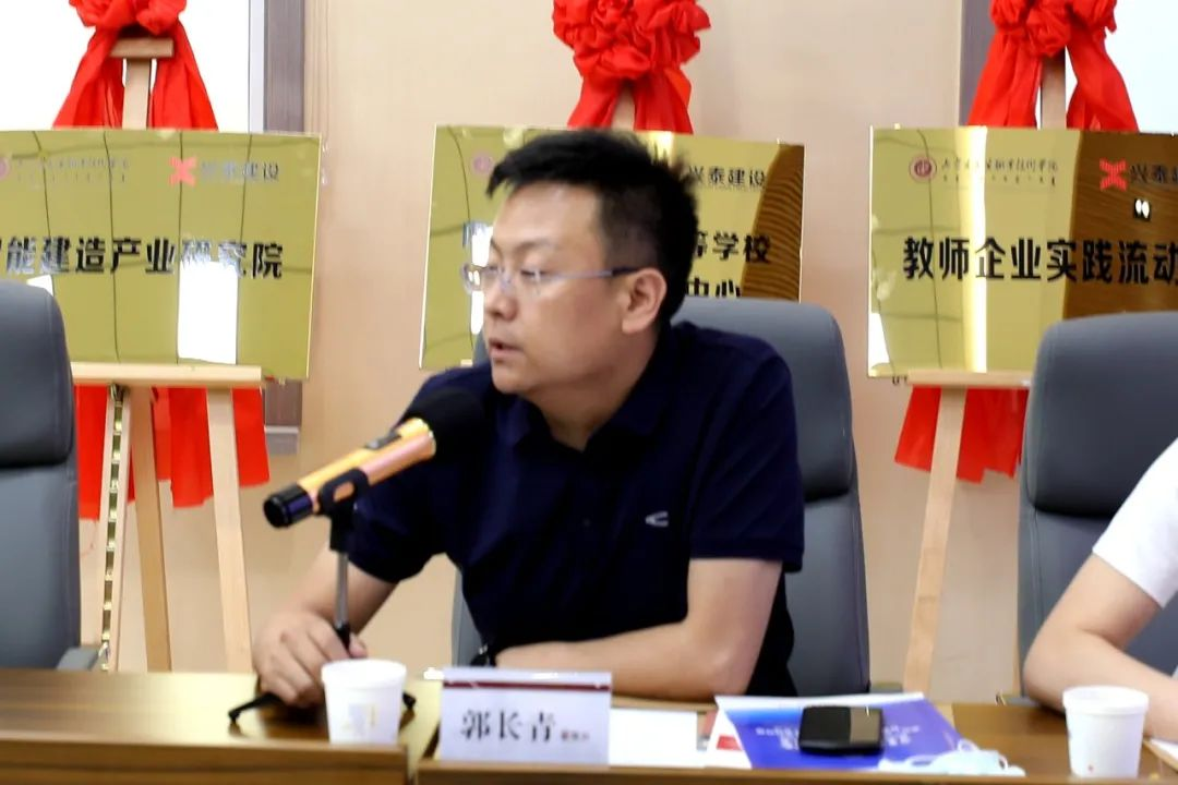 揭牌环节,牟占军与韩平共同为“智能建造产业研究院”揭牌;牛建刚与韩平共同为“BIM工程研究中心”揭牌;学校党委副书记雷建平与兴泰建设集团有限公司党委副书记、总经理邢震共同为“教师企业实践流动站” 揭牌。