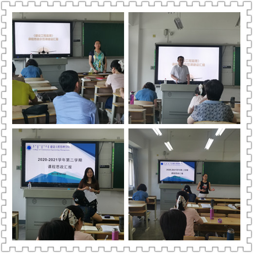 活动中,学院工程监理教研室主任孙杰老师做了《建设工程监理》课程思政示范课建设汇报。汇报紧紧围绕《高等学校课程思政建设指导纲要》,逐项介绍了课程思政示范课的建设准备、实施心得及经验教训。随后,各2020年度学院“课程思政”教育教学专题研究项目负责人进行了进度汇报,辛院长对各项目进度进行了逐项点评。