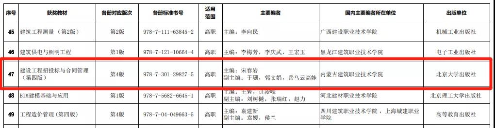近日,全国教材工作会议暨首届全国教材建设奖表彰会(视频会)在北京召开。会上表彰全国优秀教材1000种,内蒙古建职院宋春岩老师主编的教材《建设工程招投标与合同管理》获“全国教材建设二等奖”。