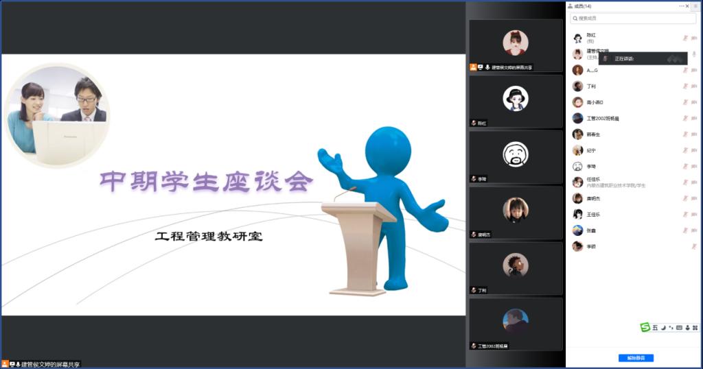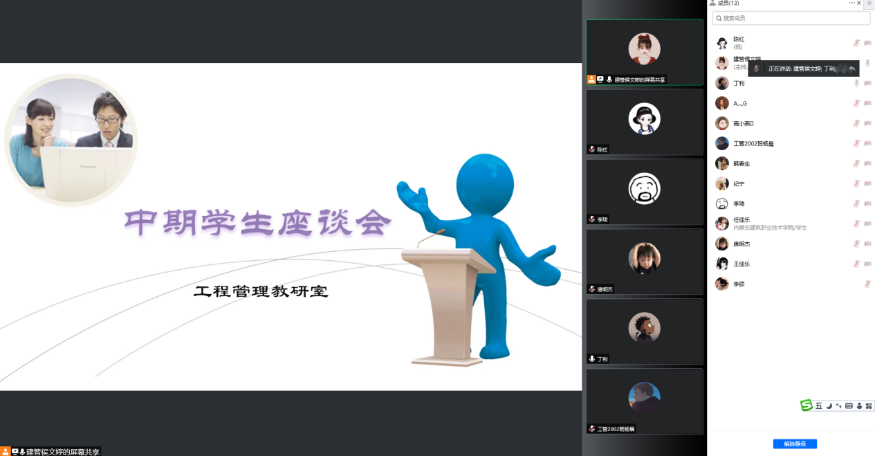 2022年5月10日晚七点,工程管理教研室通过腾讯会议形式召开“云端”中期学生座谈会,详细了解疫情期间居家学生的学习、生活、心理等实际状况。来自两个专业的20级、21级学生代表参加了座谈会,侯文婷老师、陈红老师、高小燕老师出席座谈会并与学生进行交流,会议由侯文婷老师主持。