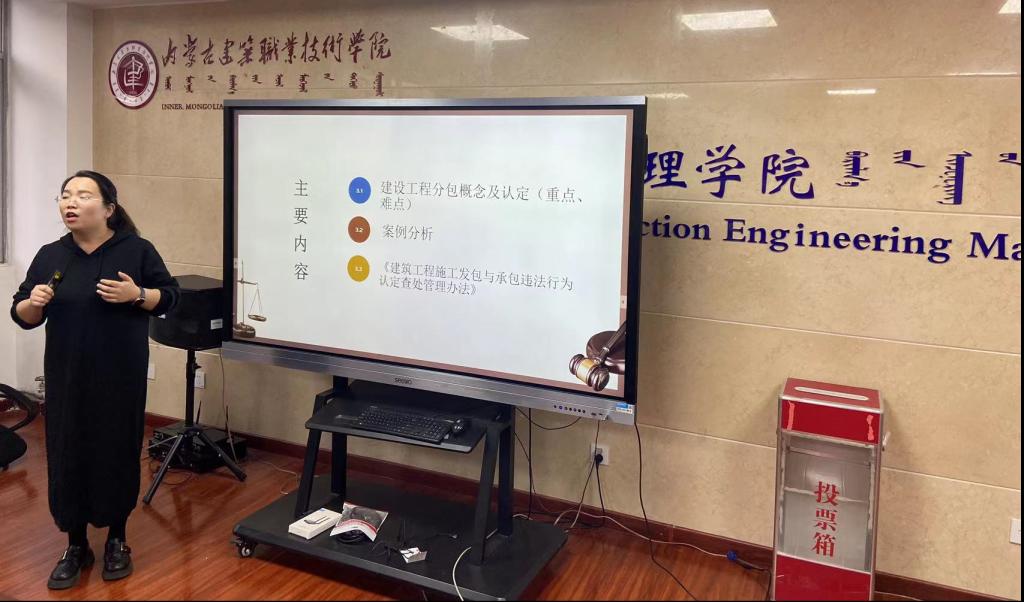 比赛中工程造价教研室教师褚菁晶结合工程经济课程风险控制内容展开了讲解,工程监理教研室教师薛亚茹围绕建设工程法律与相关法规内容进行了介绍。两位教师在展示过程中充分将习近平新时代中国特色社会主义思想润物细无声形式融入到课堂内容中,形成了精彩的课堂思政大课。