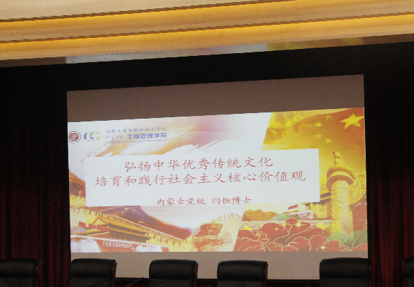 近日,受内蒙古建院工程管理学院党总支邀请,内蒙古党校闫恒老师到我校作题为《弘扬中华传统文化,培育和践行社会主义核心价值观》的专题讲座。讲座在2号教学楼一号报告厅举行。工程管理学院党总支副书记雷鸣主持报告会,工程管理学院党总支全体党员、班主任和辅导员以及学生预备党员、重点培养对象、积极分子参加了此次讲座。