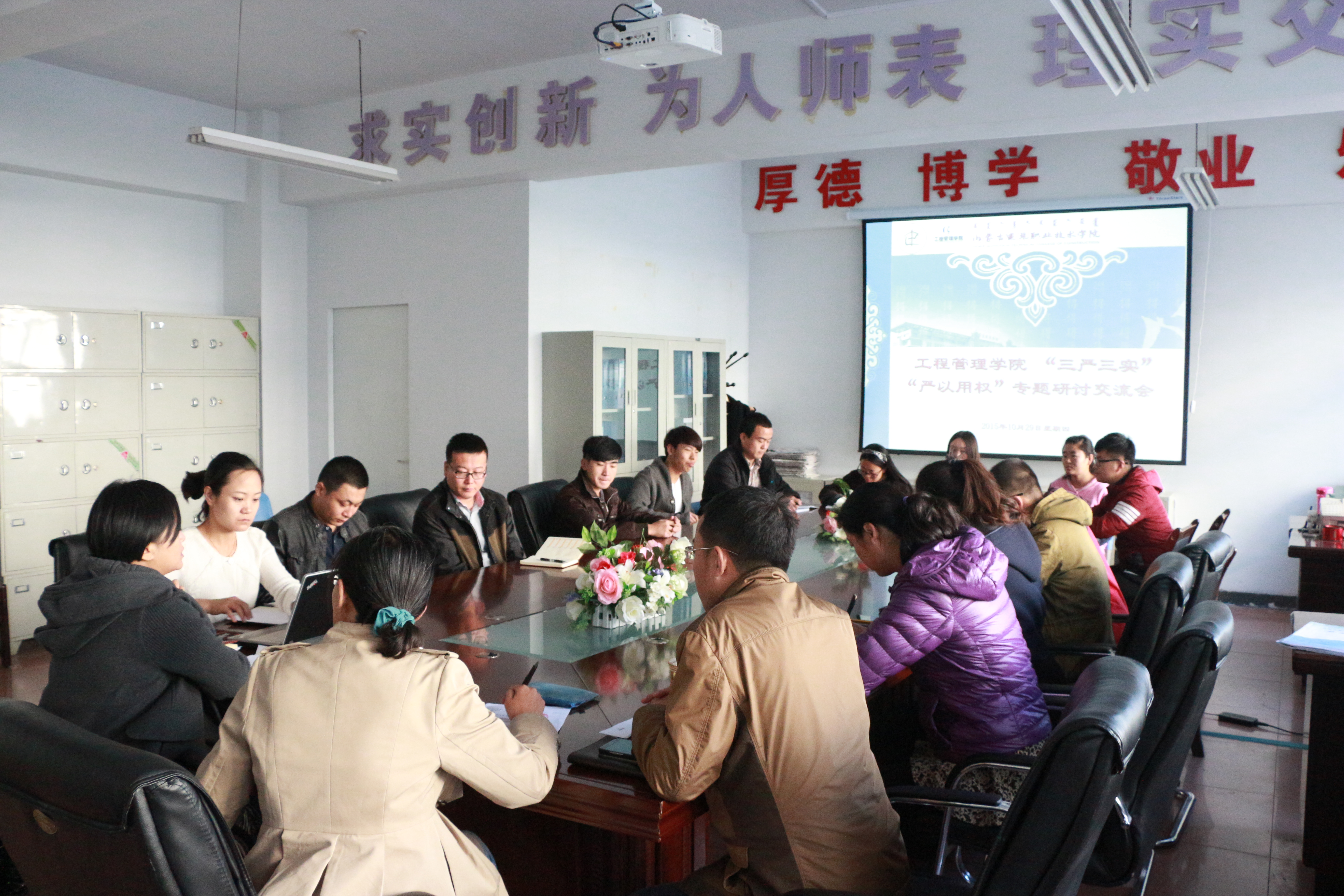 为深入贯彻“三严三实”专题教育学习的要求,我院于2015年10月29日上午十点召开“三严三实”专题教育“严以用权”主题研讨会。参与此次研讨会的有斯庆、张园、樊文广、雷鸣、全体教职工党员以及学生入党重点培养对象7人。