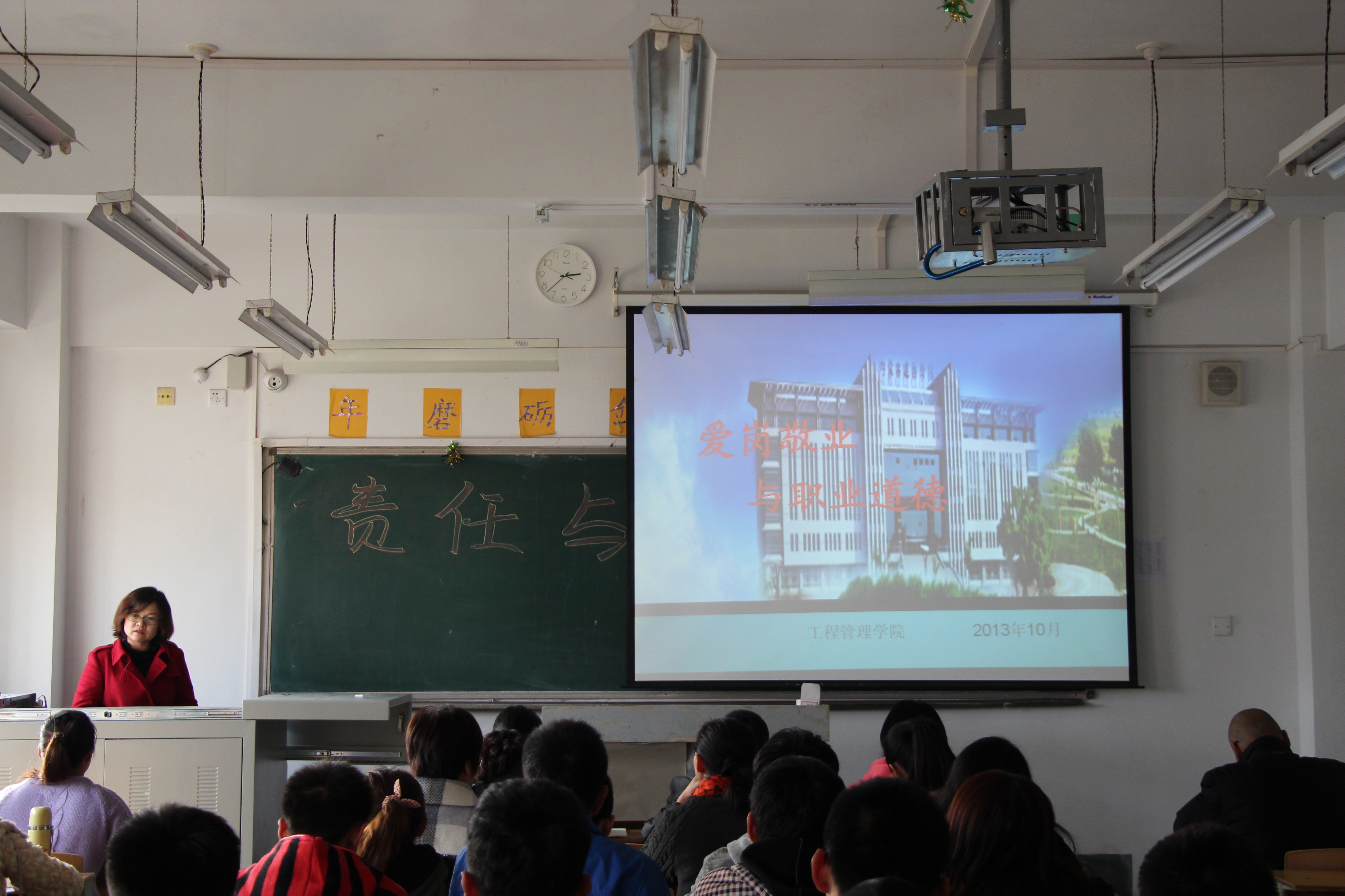 为进一步增强党员的责任意识和爱岗敬业精神,2013年10月31日下午,工程管理学院党总支书记张爱华为全体党员和部分学生代表作了一场“责任与爱岗敬业”的专题讲座。