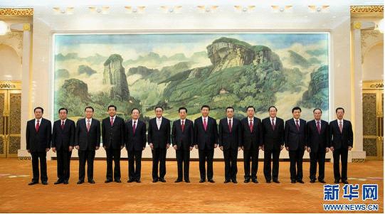 11月15日,国家主席胡锦涛,新当选的中共中央总书记、中共中央军委主席习近平,十七届中共中央政治局其他常委吴邦国、温家宝、贾庆林、李长春、贺国强、周永康,十八届中共中央政治局其他常委李克强、张德江、俞正声、刘云山、王岐山、张高丽一起合影。