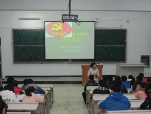 工程管理学院于2012年11月15日在2号教学楼阶梯202教室开展党课培训,工程管理学院党总支书记张爱华作为此次教课教师,为预备党员及入党积极分子讲授了一堂意义深刻的课程。
