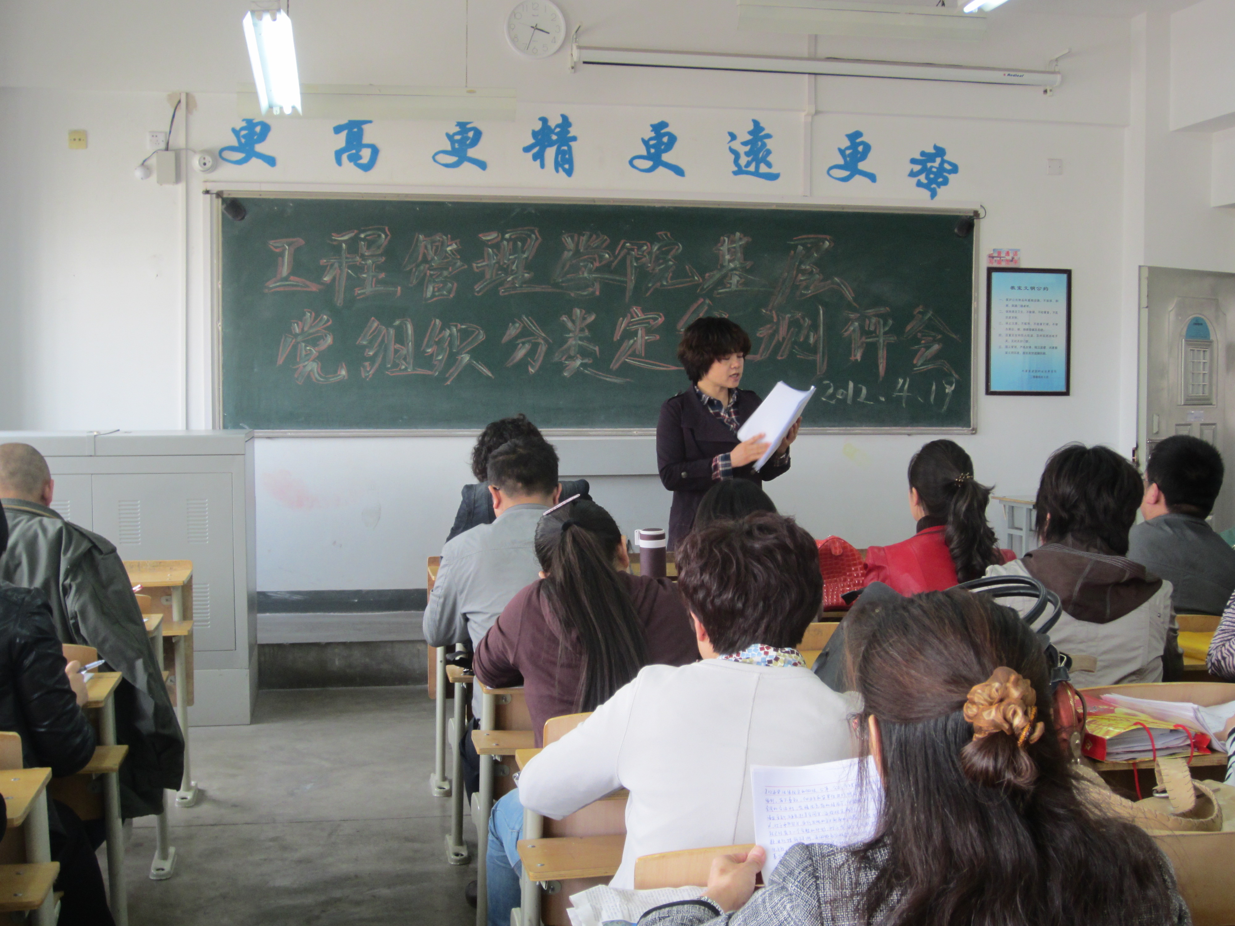 2012年4月19日下午,工程管理学院党总支按照院党委、组织部的工作部署,在1教学楼204教室召开了基层党组织分类定级测评工作会,全体党员参加会议。会议由工程管理学院党总支书记张爱华同志主持。