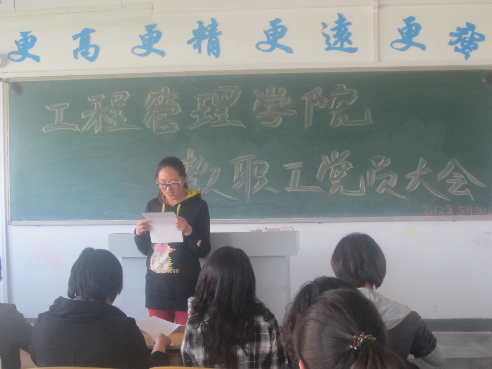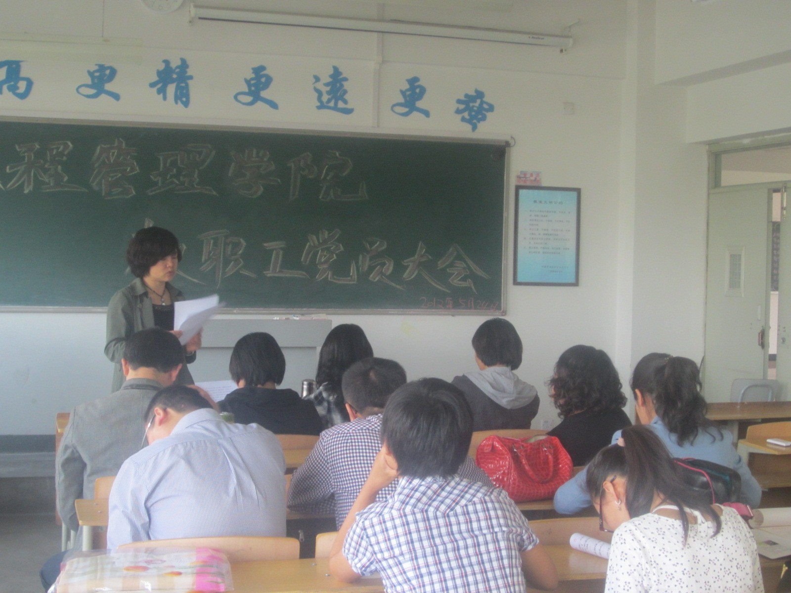 工程管理学院党总支教职工党员大会于2012年5月24日下午4:30在一号教学楼205教室举行。本次会议由党总支书记张爱华主持。