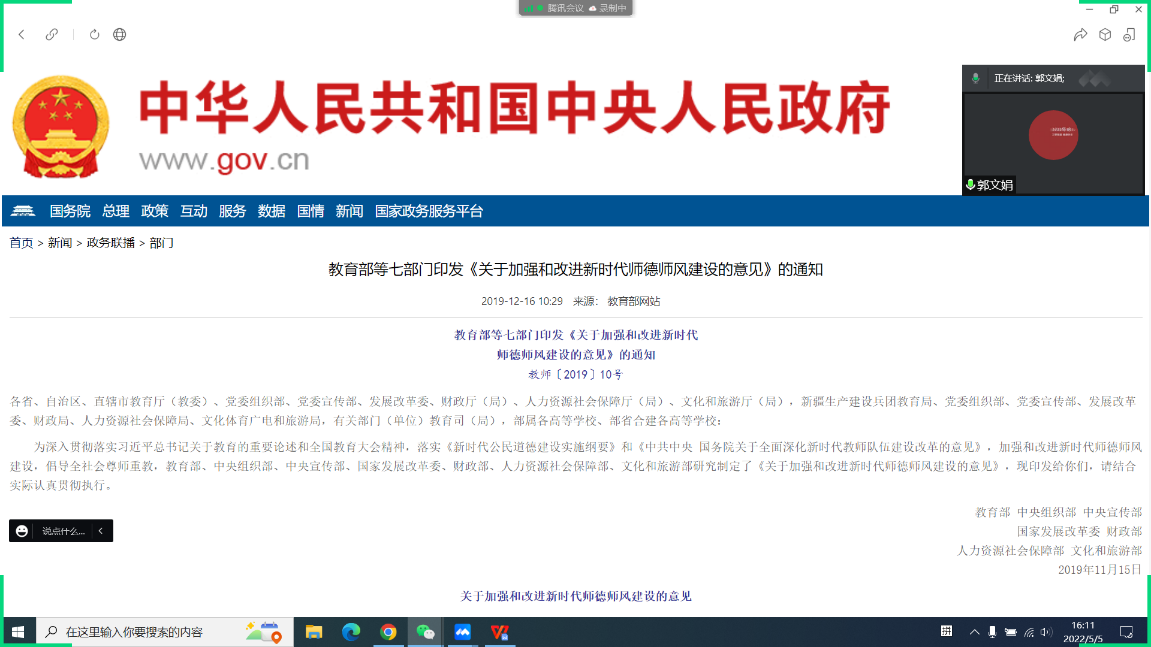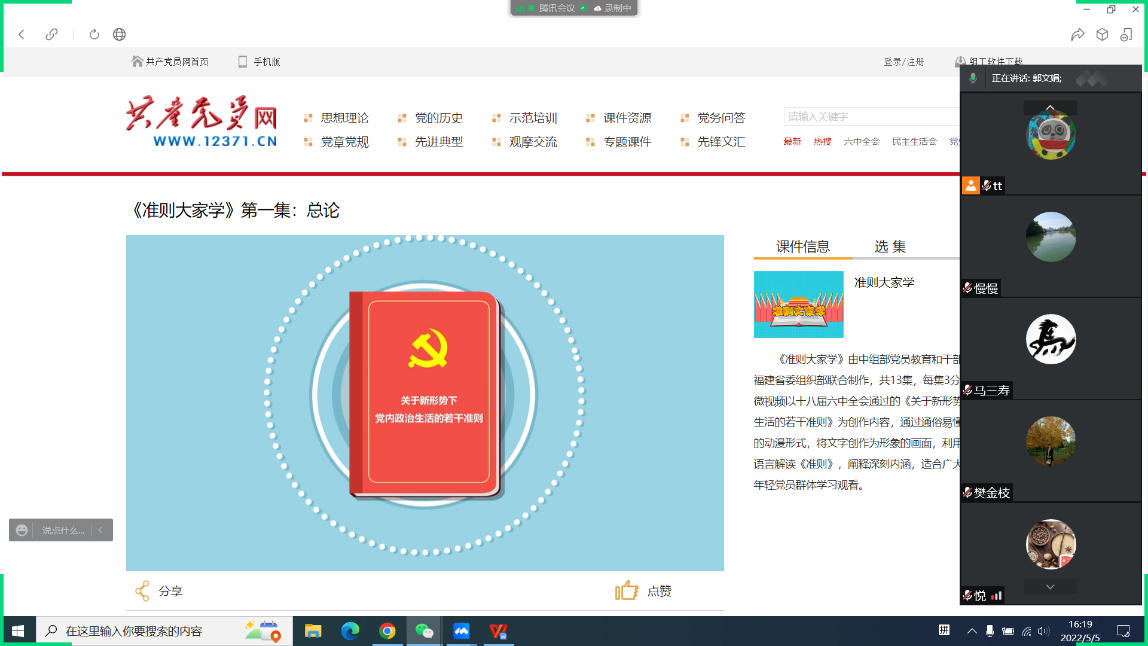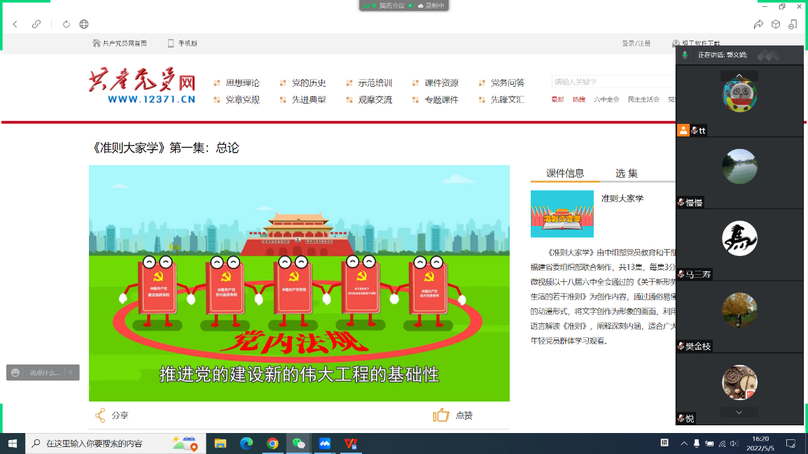 按照学校《集中治理党内政治生活庸俗化交易化问题日程安排》要求,为充分发挥党员先锋模范作用,提升党支部教师党员同志师德素养并进一步增强支部全体党员参加党内政治生活的思想自觉、行动自觉工程造价教研室党支部于2022年5月5日以腾讯会议和共产党员网为载体召开线上主题党日活动。