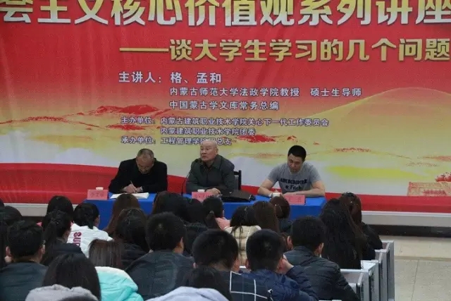参加讲座的有内蒙古师范大学法政学院教授、硕士生导师、中国蒙古学文库常务总编格·孟和教授,我院创始人之一李文章老师和工程管理学院王磊老师以及工程管理学院部分大一大二同学。讲座由王磊老师主持,主讲人由格·孟和教授担任。