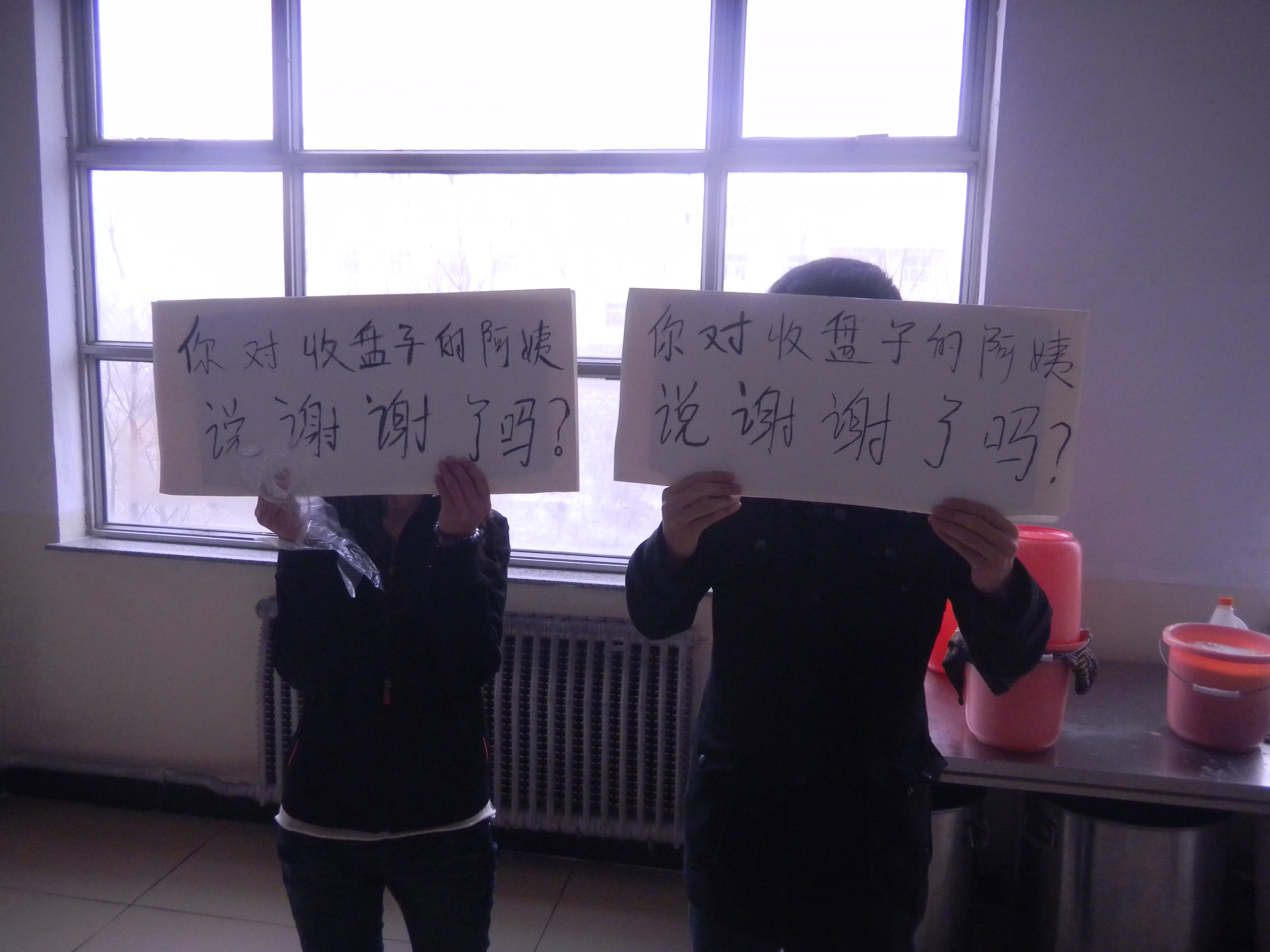 大部分学生,也许能做到每次都自觉随手收餐具,但却一直忘了做一件事,就是对辛勤劳动的阿姨们说两个字——“谢谢”。造价1102班的同学们在各个收盘处举着“你对收盘子的阿姨说谢谢了吗?”的标语牌,提醒着广大同学们向收餐具的阿姨们致以真诚的感谢。