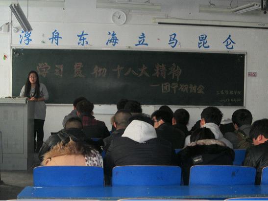 接下来,由工程管理学院工程管理1201班的团支书宋永磊同学和工程造价1204班的朱柏成同学发表争做优秀团干部的讲话,他们都表达出了对党、对国家的热爱和对工作的热情。朱柏成说到:作为团支书,虽然有时会很累,会很委屈,但有的时候想想这些都不重要,重要的是你面对一项项的工作,通过自己的努力,获得成功,为组织做出贡献。紧接着,工程造价1202班的包金玉同学还以一首《父亲的草原母亲的河》来表达对党、对祖国的美好祝福和对美丽大草原的热爱。气氛进入了高潮,同学们纷纷发表了自己对如何更好地学习贯彻十八大精神的意见,并且积极讨论了在以后的工作、生活中如何发挥自己学生干部的职责。