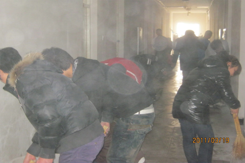 来到岗位后,同学们分配了清扫工具,有的拿扫帚,有的拿拖把,有的用小铲子,还有的同学用砂纸。拿到工具后,同学们微笑着,认真的开始清扫。无论是部长还是部员,都是那样的认真,个个半蹲姿势,用小铲子一点一点清理楼道和楼梯死角里的污垢;又用砂纸把墙上的黑印打磨的干干净净。剩下的同学则拖着拖把把楼道和楼梯拖得一尘不染。全体工作人员态度认真,务实求真,经过一中午的劳动,只见那楼道和楼梯洁净如皎白之瑕,焕然一新,墙壁有如雪之白,不带一点瑕疵。