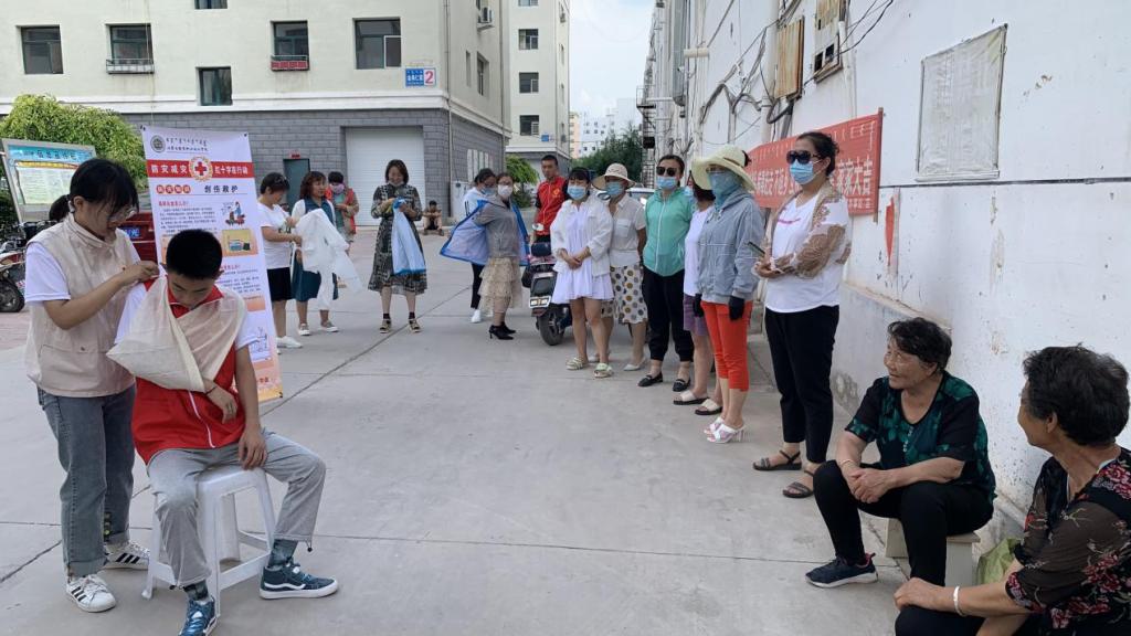 7月22日,服务队与阿旗红十字会进行座谈,在座谈会上在天山镇各城区各社区、广场、主干街道进行急救知识和防灾知识的普及宣传工作。