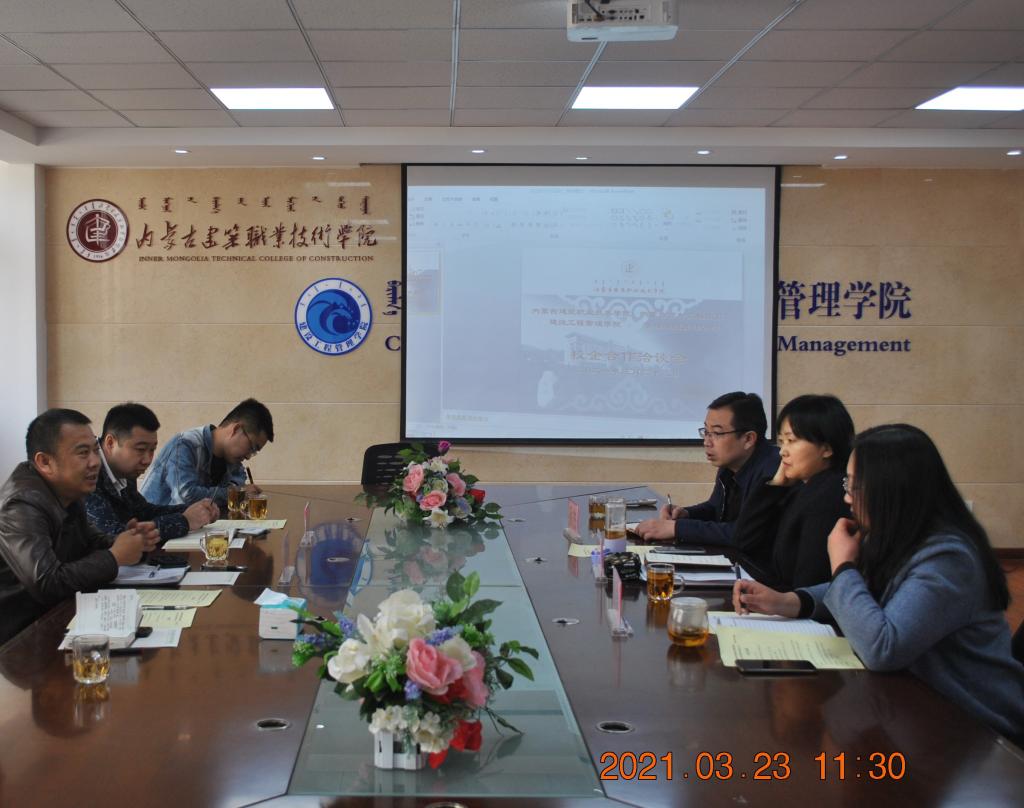 2021年3月23日上午,内蒙古建筑职业技术学院久久成人精品与内蒙古万和工程项目管理有限公司在久久成人精品会议室共同召开了“校企联合、深度互融,关于开办“产业学院”进行了交流研讨。参加本次会议的有久久成人精品党总支书记、院长斯庆、副院长岳乌云高娃和工程监理教研室副主任孙杰。内蒙古万和工程项目管理有限公司副总经理高瑞军、质量安全部部长张鑫、信息化管理办公室主任曹晓东出席了本次洽谈会。