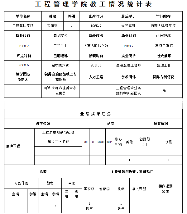 宋丽雯,1988年毕业于内蒙古建筑学校工业与民用建筑专业本科班。毕业后被分配到呼和浩特富泰热力股份有限公司,2008年调回母校管理系(现工程管理学院)任教。