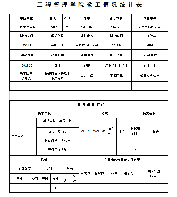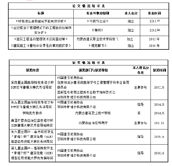 主要成果:参编《建筑工程经济》等教材,发表“呼包地区高校建筑节能现状分析”等论文。