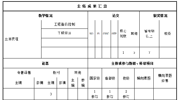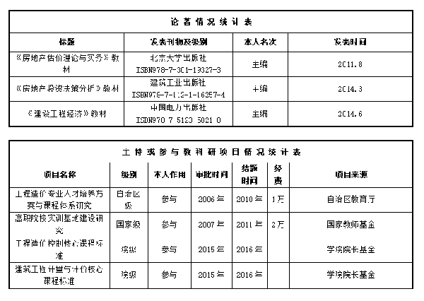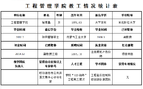 褚菁晶 副教授,国家注册房地产估价师,工程造价教研室教师。2002年毕业于东北财经大学工程管理学院,毕业后在内蒙古建筑职业技术学院任教。2008年从内蒙古工业大学毕业,取得硕士学位。在校外房地产开发企业、工程造价事务所长期从事项目策划、项目咨询及经济评价技术指导、企业员工培训等工作,现为呼和浩特市公共资源交易中心评标专家。入选内蒙古建筑职业技术学院“123名师”第三层次。
