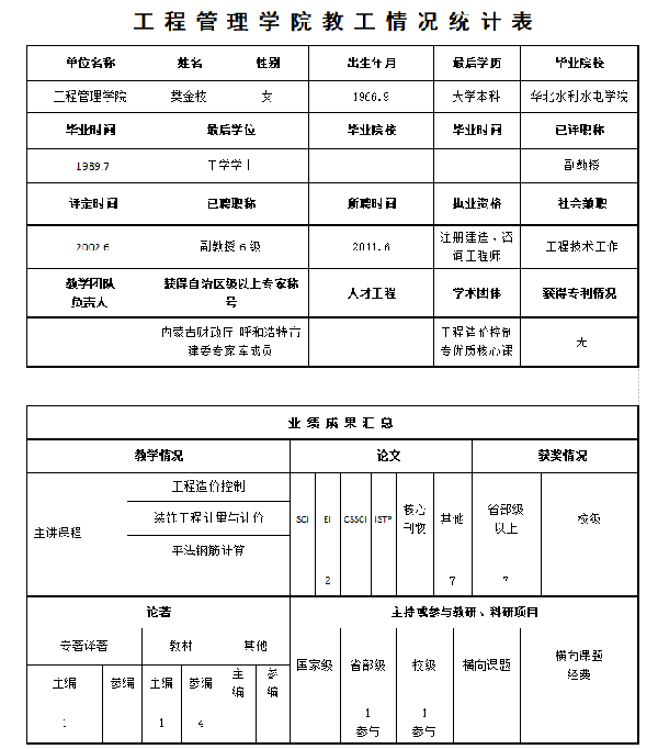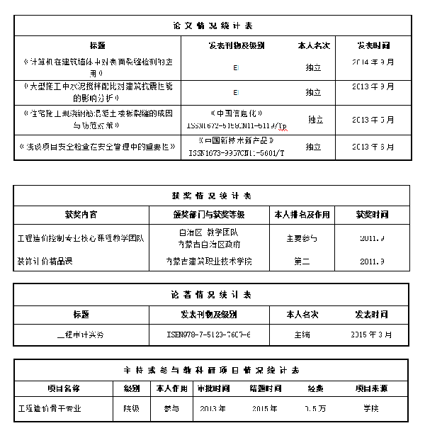 樊金枝 1989年7月毕业于华北水利水电大学 毕业后分配到内蒙古第一建筑工程公司北京分公司从事建筑工程施工技术工作 考取了国家注册建造师和注册咨询工程师职业资格证 2008年调入内蒙古建筑职业技术学院工作 副教授,工程造价教研室 先后从事过十多门课程的教学工作 ,主讲课程有《建筑工程计量与价》《装饰工程计量与计价》《平法钢筋计算》 参与社会多项重点民生工程的改造和建设工作,实践经验丰富。