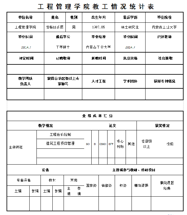 2014年毕业于内蒙古工业大学土木工程学院结构工程专业,擅长高层钢结构抗震及抗风分析。2014年12月来到内蒙古建筑职业技术学院工作,期间主要研究建设项目信息化管理(BIM)专业方向。